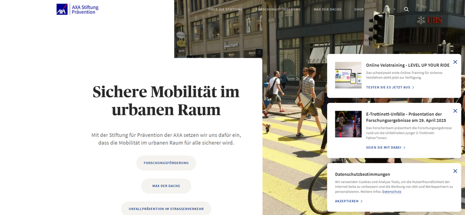 Als grösste Schweizer Motorfahrzeugversicherung nimmt die AXA ihre Verantwortung für Prävention im Strassenverkehr wahr. Von der Forschung und den Präventionsmassnahmen profitieren die Kunden wie auch die Öffentlichkeit.